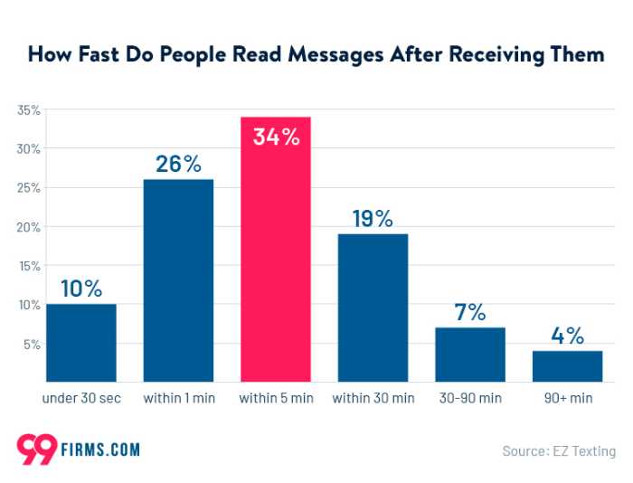Text messaging statistics show that 89% of phone users read a message within 30 minutes after receiving it.