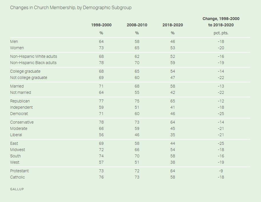 From the Gallup article titled “U.S. Church Membership Falls Below Majority for First Time,” several key findings emerge: