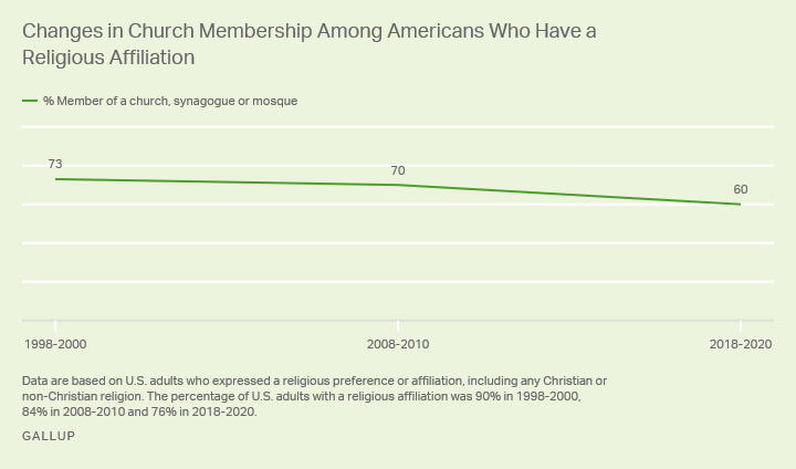 - Decline in Church Membership: As of 2020, less than half of Americans (47%) said they belonged to a church, synagogue, or mosque. This is a significant drop from the 70% membership rate recorded in 1999.